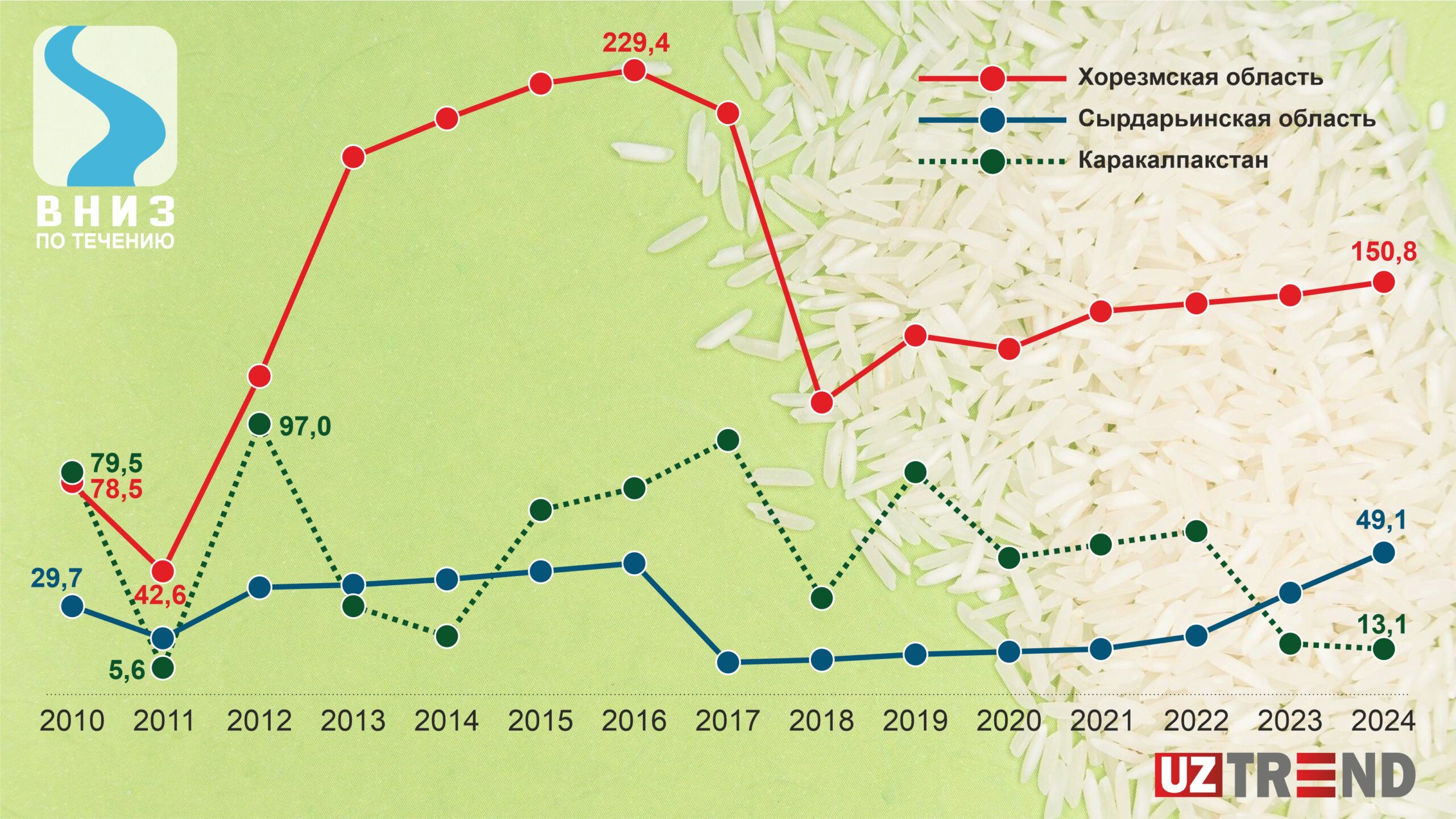 Сравним показатели производства (в тысячах тонн) в традиционном регионе выращивания этой культуры (Хорезмская область) и в Сырдарьинской, куда сегодня переезжают фермеры-мигранты. Для наглядности в инфографику добавим данные по Каракалпакстану, больше всех страдающему от нехватки воды. Пятнадцать лет назад там даже обгоняли Хорезм по выращиванию риса.